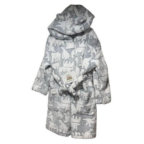 Polar Bear Robe Dressing Gown Childrens Hooded Fleece Grey Nightwear